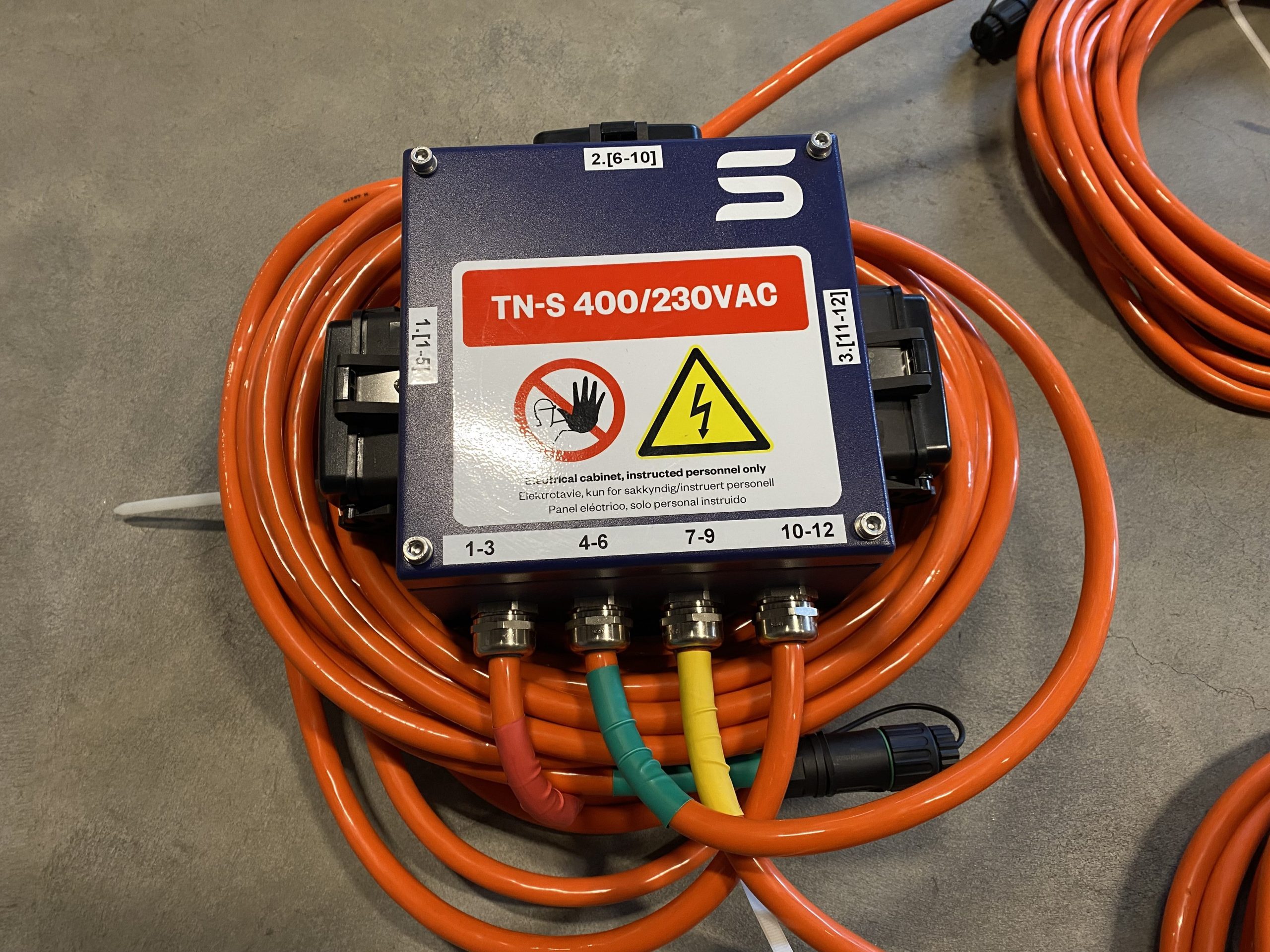 - Hovedstrømkabel kobles til strømuttak/generator.