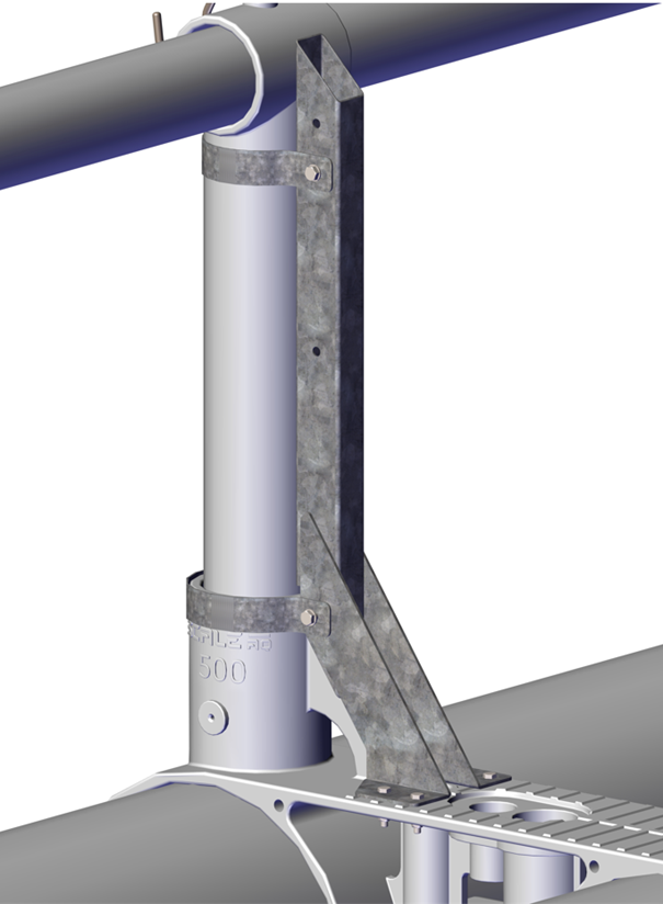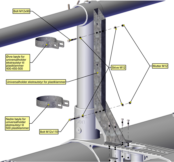 Holder ekstrautstyr festes til flyterens klammerstolpe med medfølgende skruer, skiver, mutre og festebøyler. Evt. løs opphengskrok på stolpe demonteres og festes igjen med lengre medfølgende bolter.