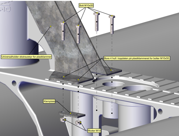 Bøylene og klemplaten festes ved hjelp av bolter, skiver og mutre som medfølger for det spesifikke varenummeret til flyterdimensjonen dette skal monteres på. For å feste holderen i topplaten på plastklammeret, må det bores 4 hull for de medfølgende boltene.