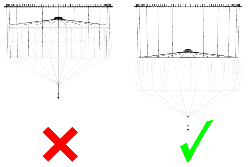 Nottak er 157m eller 160m i omkrets, og er i ytterkant festet i notpose med krysstau og flere glidelåser som til sammen går rundt hele omkretsen. Inn mot senter er det festet med krysstau til luftkuppel. Det er også en glidelås rundt luftkuppelen slik at også denne kan enkelt fjernes fra nottaket. Det er overmål i innerste nottak mot luftkuppel for å sikre at luftkuppel blir høyeste punkt i nottak samt at dette forenkler installasjon av nottaket. Tegning av nottak med avstander vises i Figur 5.