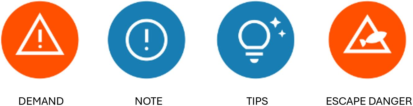 Important information is labelled with the following symbols: